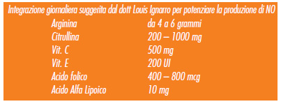 - Utilizzare frutti rossi o succo d’uva o, se gradito, con moderazione vino rosso. Il resveratrolo, un polifenolo presente in questi prodotti, ha azione antiossidante, rallenta i processi di invecchiamento ed incrementa i livelli di NO. – Integrare con L arginina. Una buona idea per elevare la concentrazione di ossido nitrico potrebbe essere quella di utilizzare specifici integratori per questo scopo. Sappiamo che è soprattutto l’aminoacido arginina a produrre NO nell’endotelio, tuttavia ritengo che le indicazioni più precise non possano essere che quelle suggerite da Louis Ignarro, il quale consiglia oltre all’assunzione giornaliera di 4–6 grammi di arginina, da 200 a 100 mg di citrullina, aminoacido che ha un effetto sinergico con il precedente, potenziando la produzione di NO, 500 mg di vitamina C, la quale migliora la funzionalità dell’endotelio, potenziando la produzione di NO, 200 IU di vitamina E, la sua azione antiossidante protegge l’ossido nitrico dai radicali liberi, da 400 a 800 mcg di acido folico, che ha la capacità di ridurre i livelli di omocisteina, un aminoacido che danneggia le cellule endoteliali, 10 mg di acido alfa lipoico, che ha un’azione antiossidante ad ampio spettro d’azione, essendo questo prodotto sia idrosolubile, sia liposolubile, con effetti benefici nella protezione dell’endotelio. Inoltre l’ALA potenzia l’efficacia antiossidante di vit C e vit E.