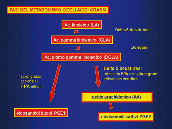 Il metabolismo degli acidi grassi (in particolare in figura quello degli Omega 6) dimostra come l’attivazione e l’inattivazione